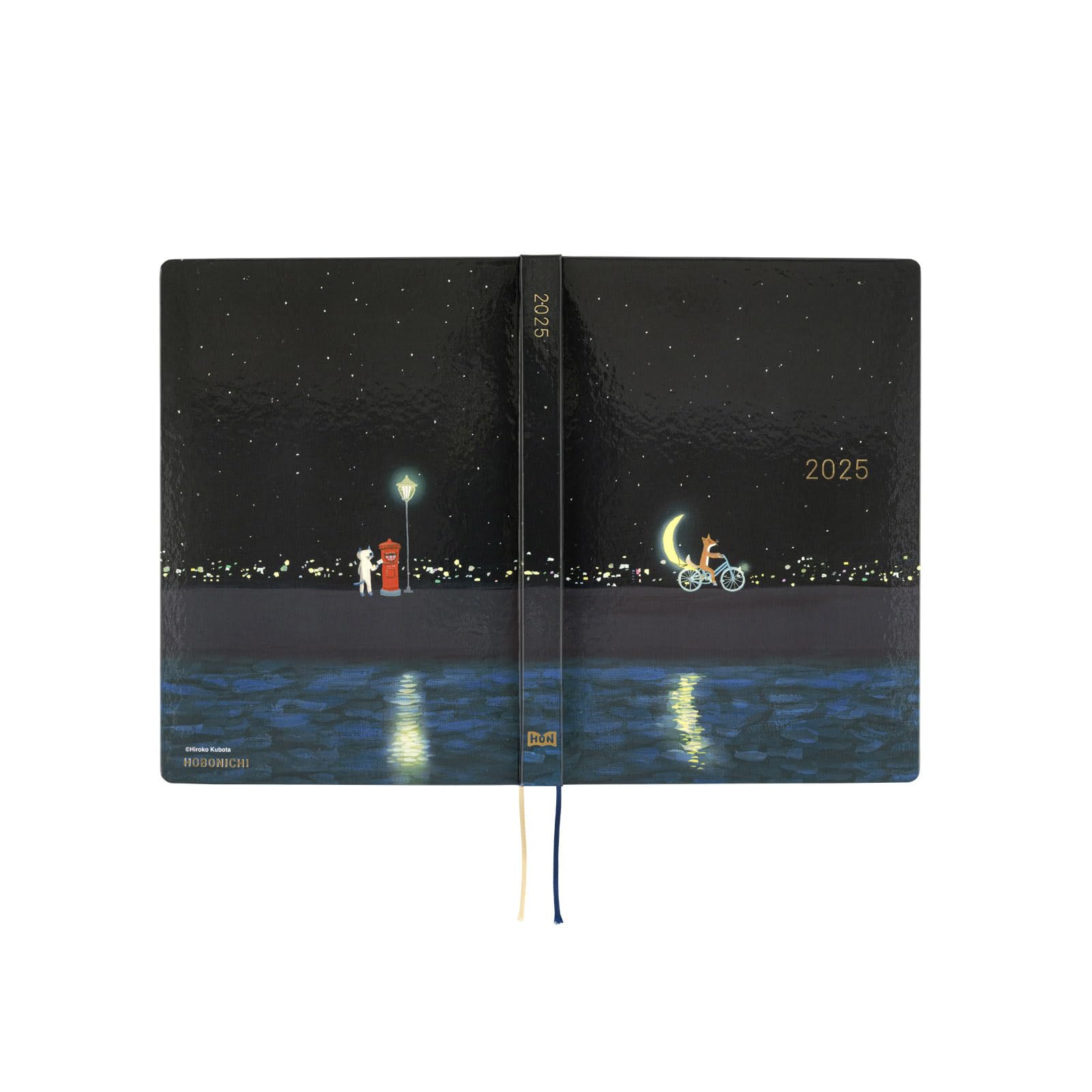 - ART BY HIROKO KUBOTA-This A5 size Hobonichi Techo book has one page per day.The hardcover book has some give to it so it still bends, and comes with a pencil board.This imaginative illustration depicts a fox riding a bicycle to deliver a crescent moon.The back of the cover shows a cat mailing a letter in a mailbox at the foot of a street lamp. The year 2025 is foil-stamped in a slightly matte gold.