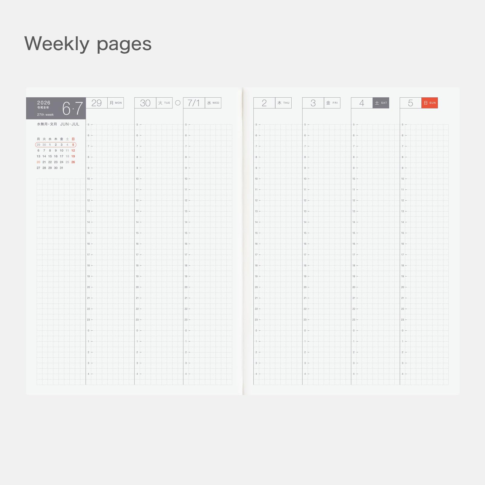 - A5 size × 2 books (Each: 210 x 148 x 10 mm / 8.3" x 5.8" x 0.4"); approx. 260g per book; 288 pages each; Japanese. Tomoe River paper. 3.7mm graph paper; Monday-start week.