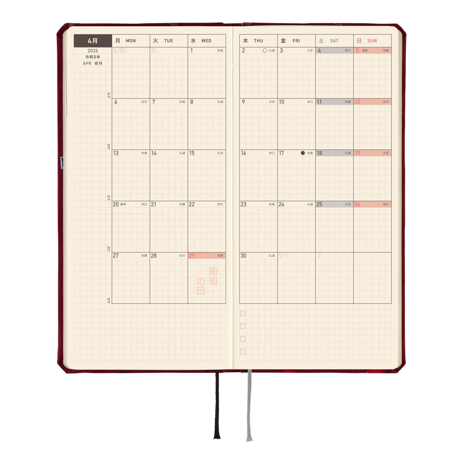 - COLLABORATION with MOOMIN – This Weeks planner collaborates with Moomin, the famous character from the novel "Finn Family Moomin troll." Set against a calm, reddish tone, the design is woven with various expressions and poses of Little My—laughing, frowning, eating fruit, and more—all intricately rendered through the detailed weave of the fabric, just like on a necktie. The year 2026 is foil-pressed in reddish gold on the front cover.