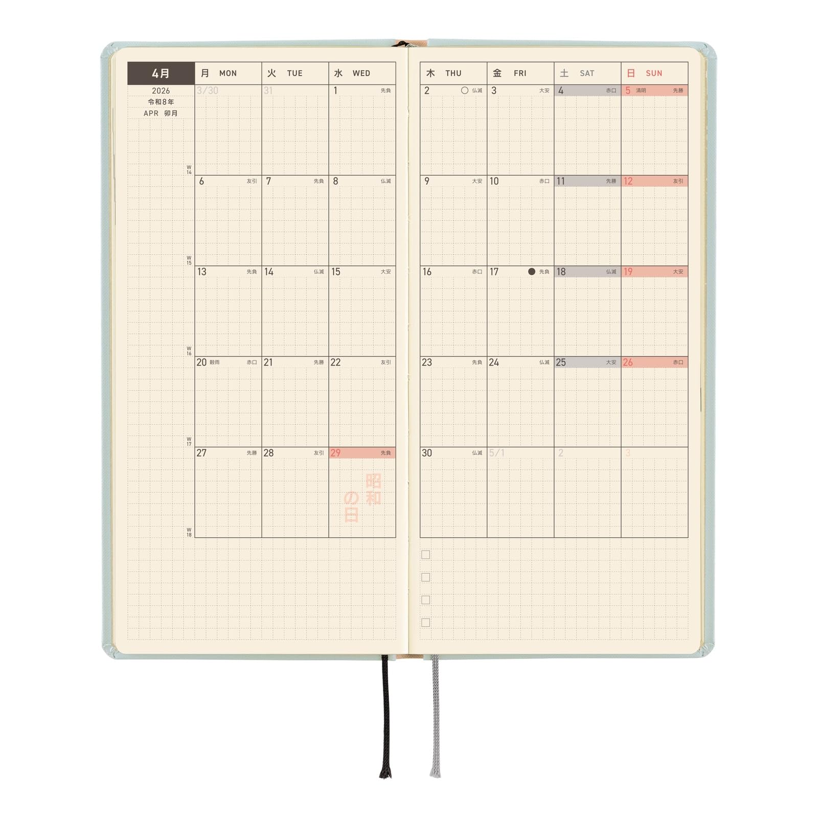 - 240 pages; Japanese. Made with Tomoe River paper and stitch-binding. 3.55mm graph paper; Monday-start week. Size: H188 × W94 × T11 mm / H: 7.4" × W: 3.7" × T: 0.4" (specifications may vary slightly) | Weight: approx.140g