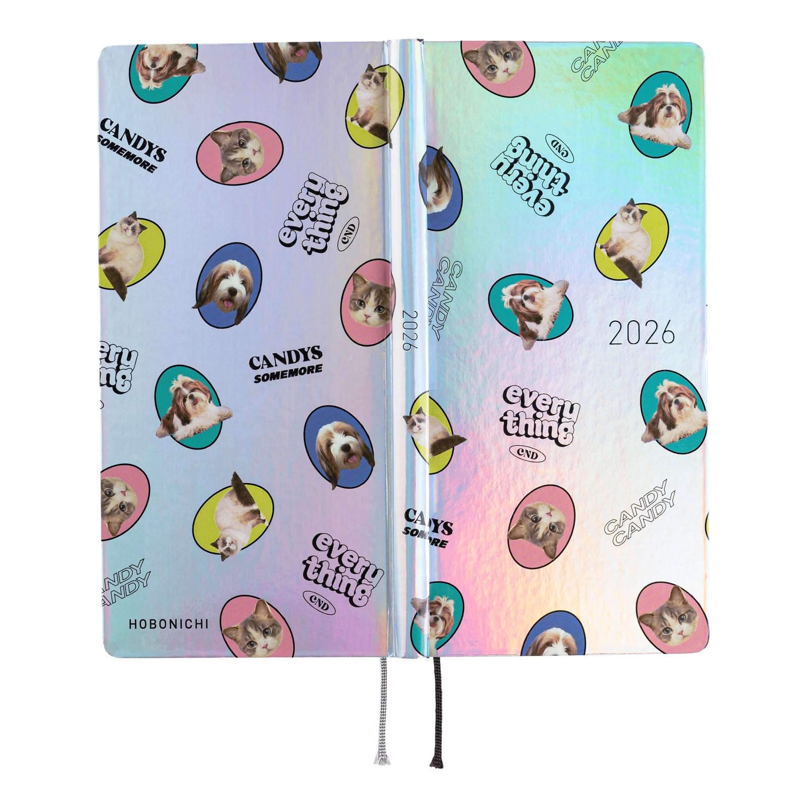 - COLLABORATION with CANDY STRIPPER – This Weeks planner collaborates with the fashion brand "Candy Stripper." Cute pictures of dogs and cats are randomly printed on the cover along with the brand logo. The planner cover material is shiny in aurora colors, changing colors depending on the angle you see from. The year "2026" is foil-pressed in black on the front cover.